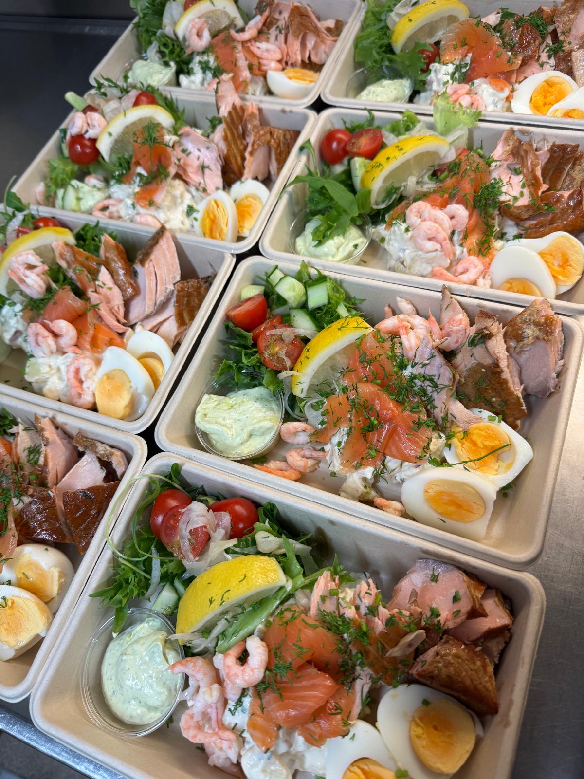 Lämminsavulohi, graavilohi, käsinkuorittuja katkarapuja, kananmuna, vihersalaatti, sitruunamajoneesi ja Skarpuddenin näkkileipä.